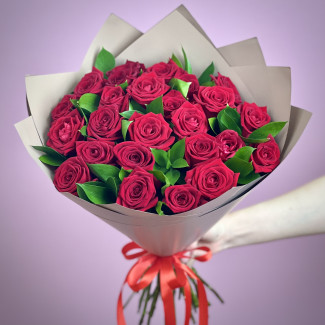 Букет из 25 красных роз 60 см с зеленью расскажет о ваших чувствах лучше любых слов. Если вы хотите сделать сюрприз для любимой или признаться в своих чувствах, заказывайте цветы в нашем магазине. В стандартный состав композиции входят 25 роз с длиной стебля 60 см и пучок зеленого сочного салала, который подчеркивает красоту страстных ярко-красных бутонов. Есть вариация делюкс, в составе которой 35 роз. Растения свежие, ароматные, с хорошей стойкостью, высокого качества. Гарантия действует в течение 5 дней.