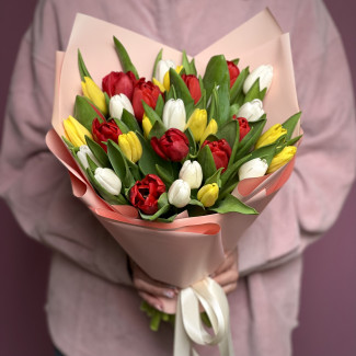 Букет из 31 тюльпана с выбором подходящего оттенка. Нежные и красивые цветы символизируют взаимную и безмятежную любовь, верность и чистоту. Тюльпаны ассоциируются с удачей и победами, передают искренние пожелания счастья и процветания.